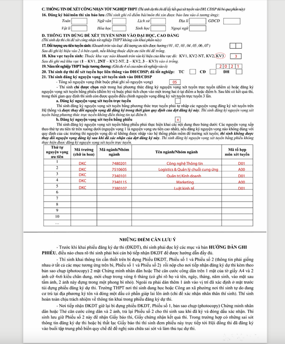 Ghi theo hướng dẫn trên phiếu ĐKDT. Đối với điểm a: thông tin đăng ký nguyện vọng xét tuyển trực tuyến có giá trị pháp lý như việc đăng ký nguyện vọng xét tuyển bằng phiếu. Thí sinh phải tự chịu trách nhiệm các thông tin đăng ký nguyện vọng xét tuyển trực tuyến đã kê khai trên hệ thống.