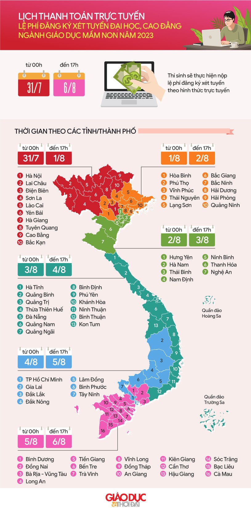 Để đảm bảo an toàn, thuận lợi, tránh hiện tượng quá tải trong quá trình thí sinh thực hiện thanh toán trực tuyến, Bộ GD&ĐT thông báo lịch thí sinh thực hiện thanh toán trực tuyến trên Hệ thống theo các tỉnh/thành phố (nơi thí sinh đã nộp hồ sơ) như sau: