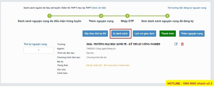 Thí sinh nhấn "In danh sách" để thực hiện in danh sách các nguyện vọng.
